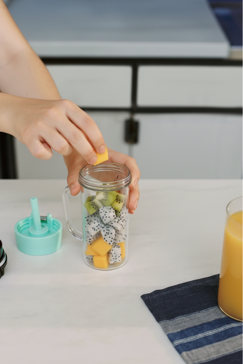 Diseñada para mujeres activas que cuidan su cuerpo y su ritmo. Ideal para llevar al gym, al trabajo o en tus escapadas de finde. Carga USB, diseño compacto y tapa con pajita incorporada para beber directamente. Sí, todo en uno.
